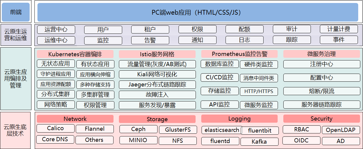主要提供容器編排,多集群管理、應用管理、服務網格,微服務治理,監控告警,權限與(yu) 安全等功能